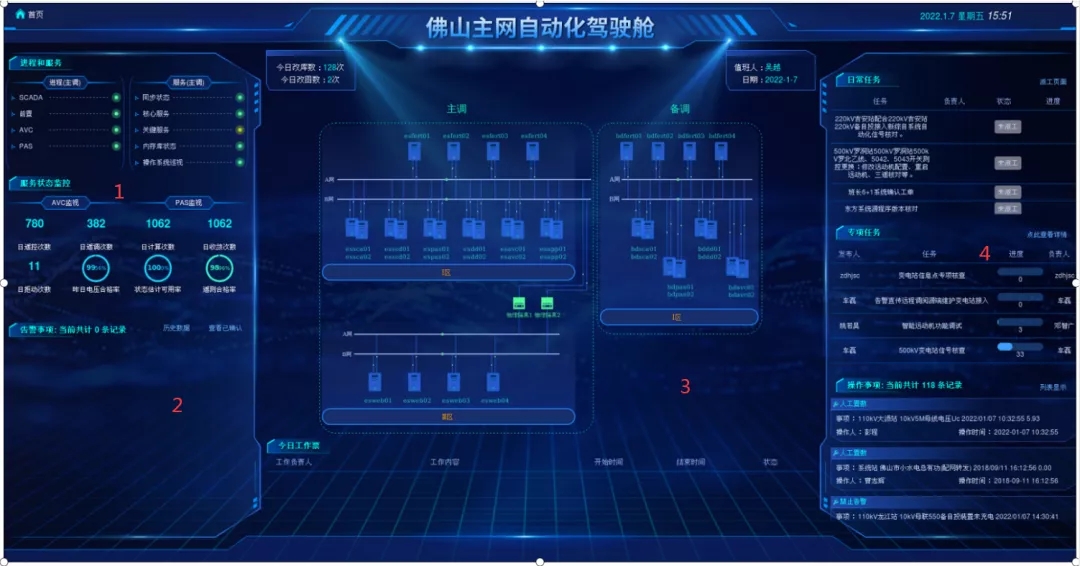 The automatic cockpit integrates panoramic data and controls various professional systems, and provides "one-stop" services that comprehensively reflect the key operation state of the power grid, customize the work panel as required and control the closed-loop task flow through the deployment of functions such as panoramic monitoring of business indicators, customized configuration of work desk and task flow management.