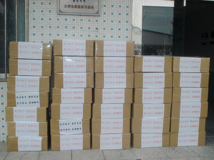21日下午4点,免费运输赈灾物资的车辆到达,公司领导和工人们一起动手装车。满载着乐鱼电子全体员工期盼和祝福的照明设备运往雅安灾区……